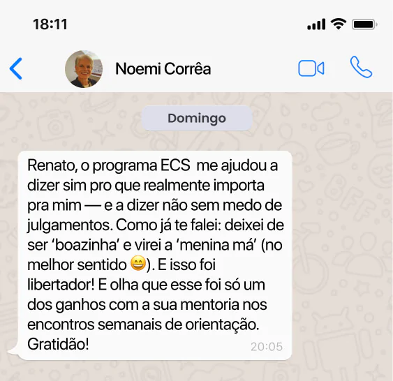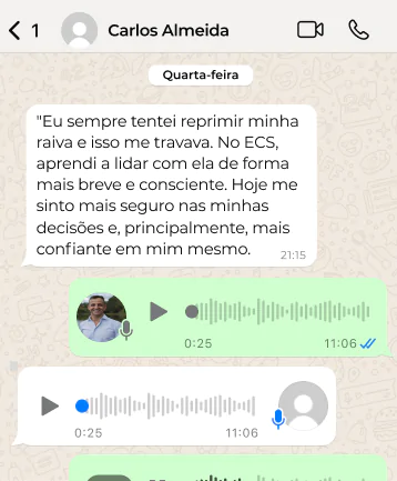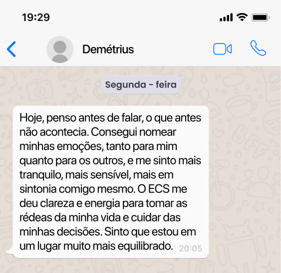 Demétrius chegou ao ECS buscando reconexão e encontrou muito mais: Ganhou clareza nas decisões, aprendeu a verbalizar emoções sem impulsividade e desenvolveu autonomia emocional. Hoje, vive com mais calma, controla a ansiedade e sente, de fato, que está no comando do próprio caminho. Clique e veja como ele conquistou paz interior e liberdade emocional.