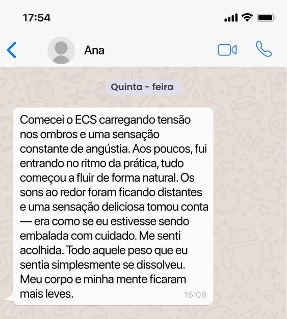 Mariane, empresária do ramo de calçados, chegou ao ECS à beira de um colapso físico e emocional. Com as práticas, aprendeu a expressar emoções, tomar decisões com sabedoria e liberar raivas acumuladas. Hoje, vive com mais leveza, cuida melhor das relações no trabalho, ensina a filha sobre emoções e redescobriu o prazer de estar presente também no casamento. Clique e veja como ela saiu do limite e entrou numa nova fase da vida.