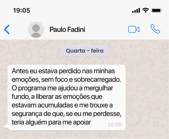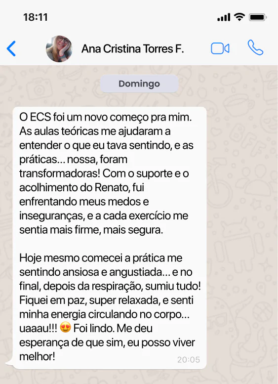 Paulo Henrique, empresário em Votorantim/SP, se sentia desconectado do próprio corpo e dominado pela ansiedade. No ECS, aprendeu a sentir suas emoções com segurança — entendeu que elas vêm e vão como ondas. Ao acessar a vibração da pélvis e despertar a alegria, a angústia deu lugar à presença, leveza e prazer de estar vivo. Assista e veja como ele transformou tensão em potência com o apoio certo.